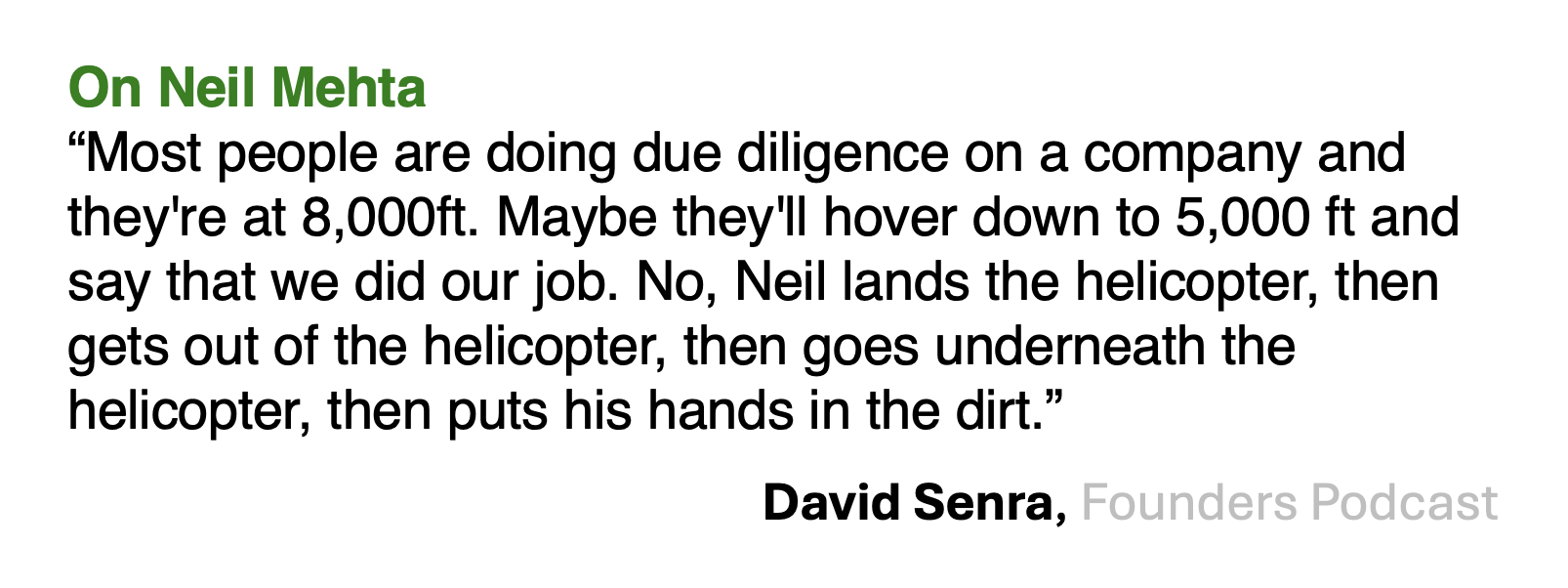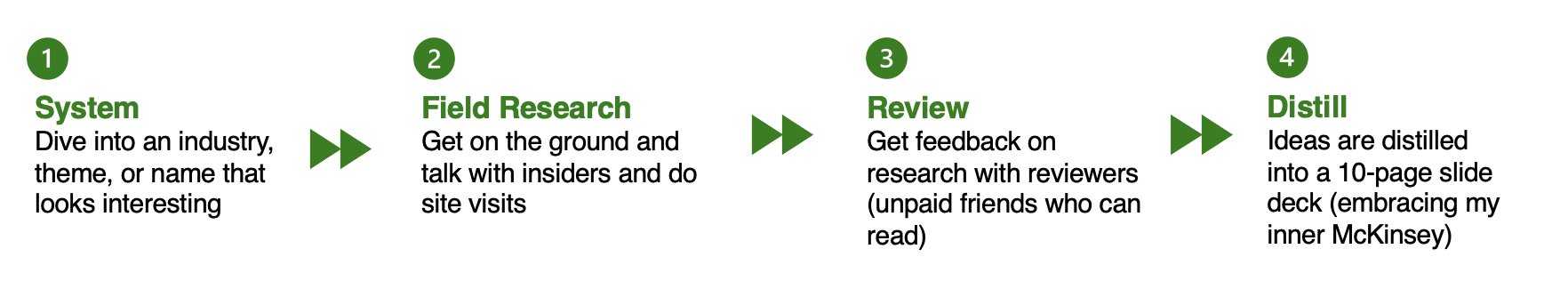 The research approach I’ve found myself to enjoy is this form of helicopter research as described in this interview with David Senra. You’ll find that the research approach I think looks something like this:
